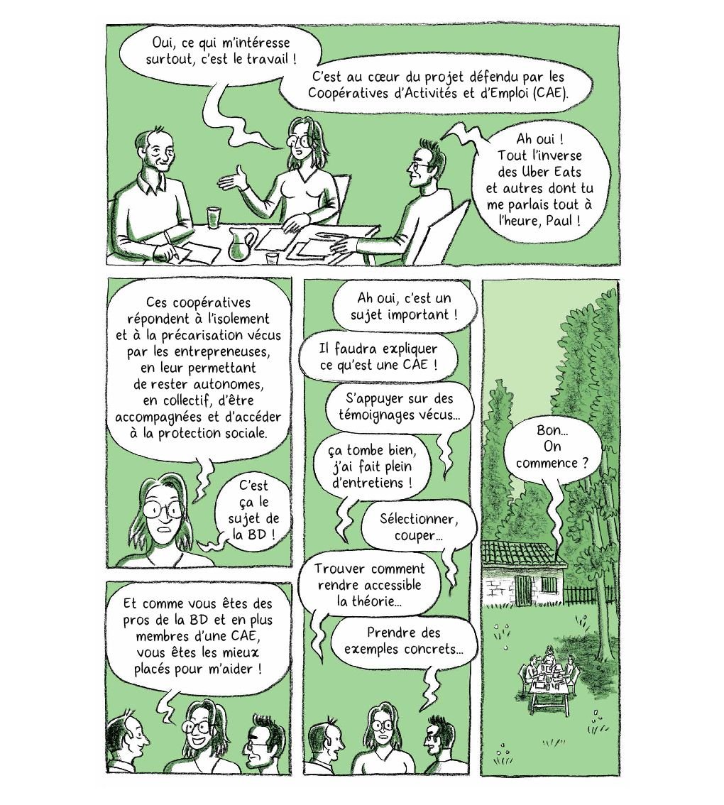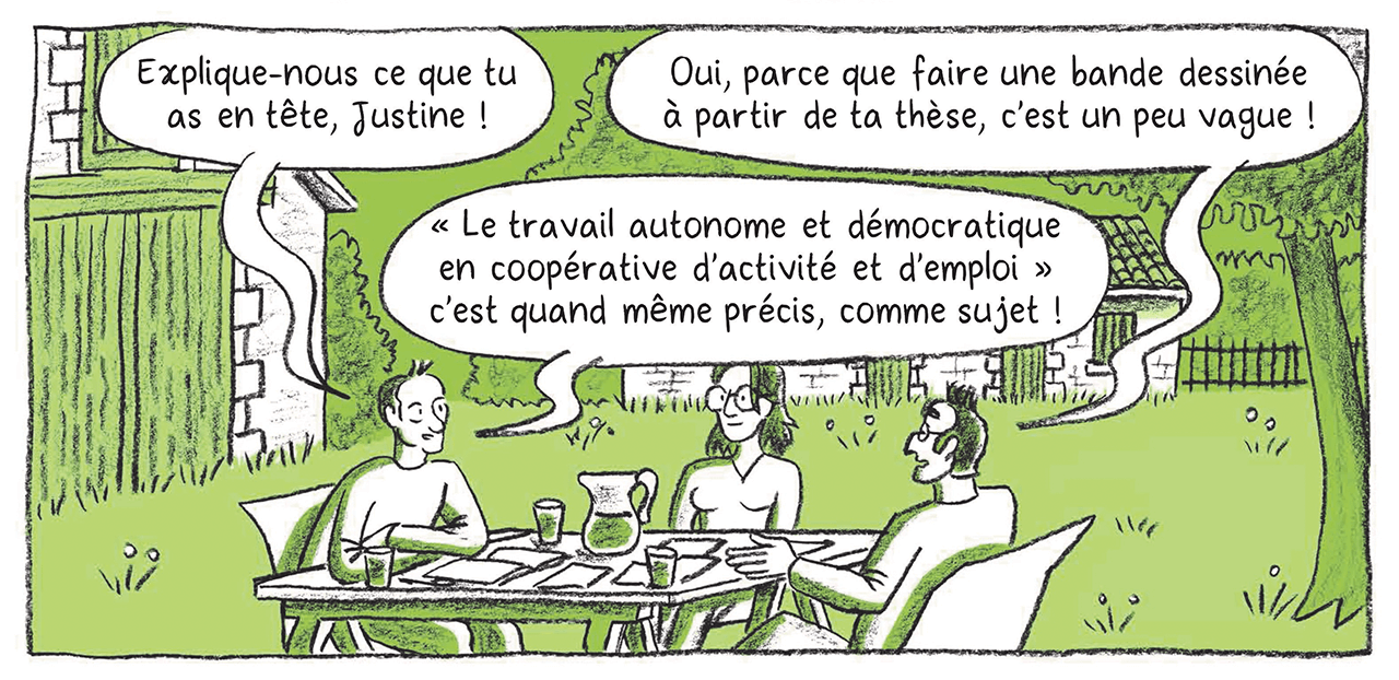 Tout part de la thèse en économie de Justine portant notamment sur le travail autonome et démocratique dans les CAE. Au fil de 8 chapitres, une discussion entre Justine, Pierre-Laurent, Paul et Claire amène l’avatar de Justine à présenter sa thèse, illustrée de façon pédagogique et humoristique, au fil des témoignages de 4 personnages fictifs d’Amina (chargée d’accompagnement), Joëlle, Daniel et Alban entrepreneur·ses salarié·es chez Coopaname, Oxalis et Artenréel, inspirés des parcours de personnes réelles interviewées durant la recherche.